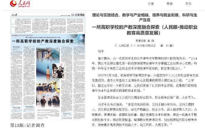 5月12日,《人民日报》刊发整版图文,以《理论与实践结合,教学与产业相融,培养与就业衔接,科研与生产互促——一所高职学校的产教深度融合探索》为题,6000字长文深度聚焦我校产教融合育人,助推高质量发展的生动实践。