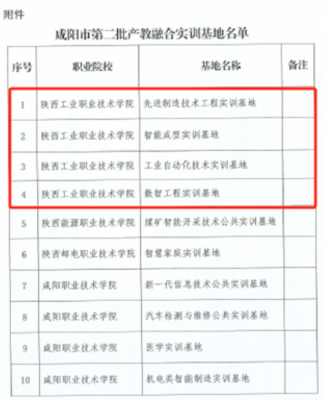 为搭建产教融合创新驱动平台,加快推进咸阳市国家产教融合试点城市建设,11月22日,咸阳市国家产教融合试点城市建设领导小组办公室印发《关于公布咸阳市第二批产教融合实训基地的通知》,认定10个实训基地为咸阳市第二批产教融合实训基地。我校“先进制造技术工程实训基地”“智能成型实训基地”“工业自动化技术实训基地”和“数智工程实训基地”4个产教融合实训基地成功入选。